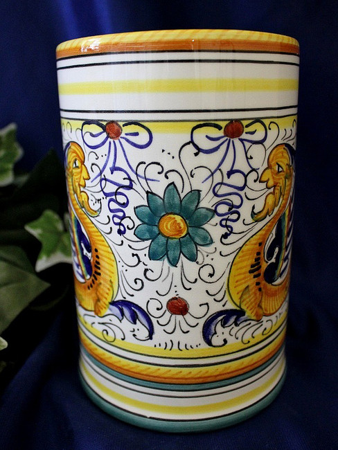 The beautiful, Deruta Raffaellesco Wine Cooler. One of Deruta's most popular and enduring Renaissance patterns, Raffaellesco traces its origins to the 16th century and the Elegant arabesques of the Famous Raphael's frescoes in the Vatican. Raffaellesco is a compassionate deity bestowing good luck to seagoing merchants with the wind puffs steaming from the dragon's mouth. This hand-painted Deruta wine cooler makes a great gift when paired with a bottle of Italian wine. Doubles as a Utensil Holder, Bottled Water Caddy or lovely Flower Vase and Table Centrepiece. Many uses for this Elegant and Sophisticated Deruta wine cooler. The hand-painted Italian artwork and detailing on this piece are magnificent.